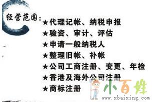 1、免费代办公司注册;2、专业代理记账;3、专业代办注销、代办变更;4、代办食品经营许可证;5、商标注册,商务咨询;...